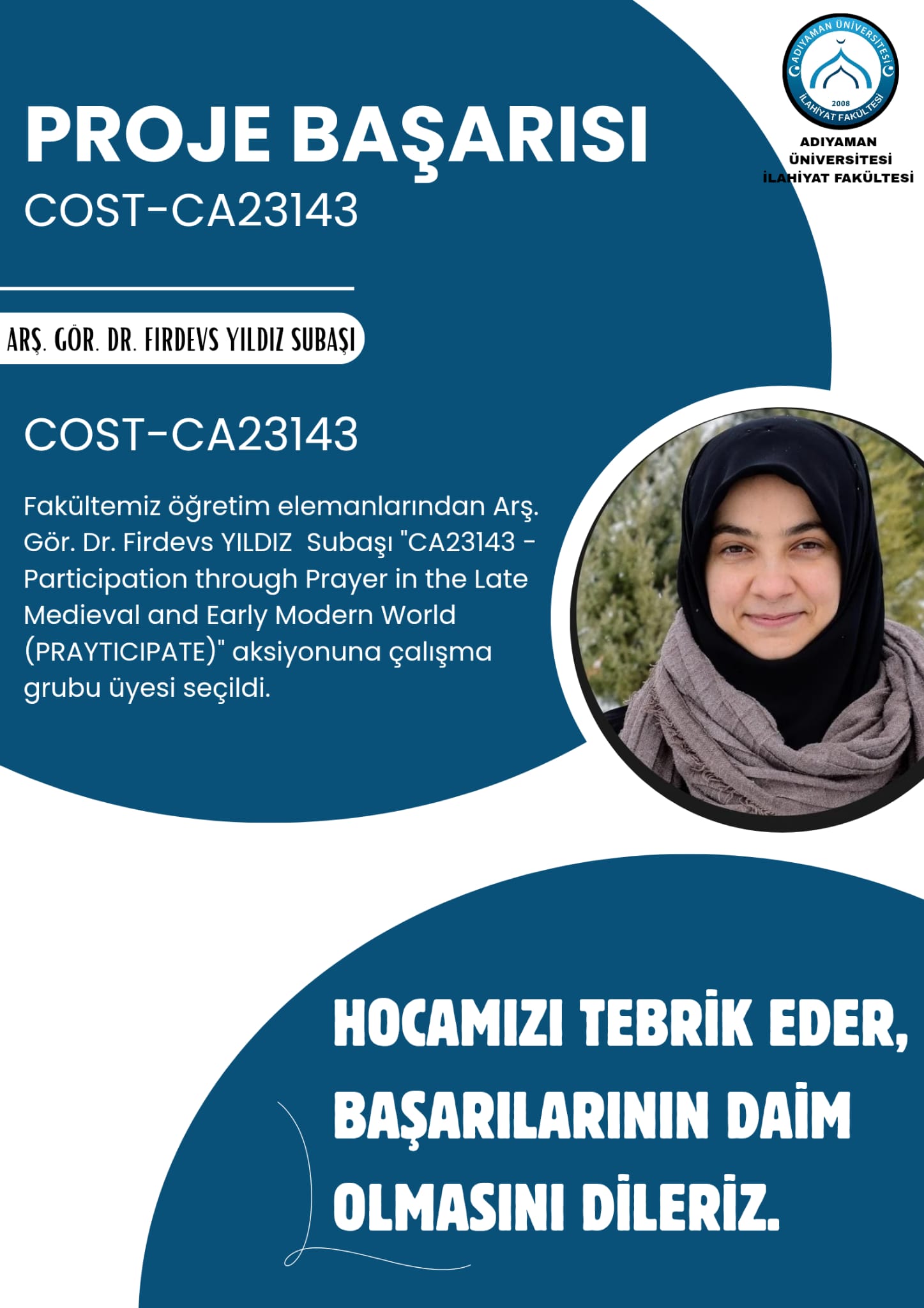 Adıyaman Üniversitesi İlahiyat Fakültesi Arş. Gör. Dr. Firdevs Yıldız Subaşı COST-CA23143 aksiyonuna çalışma grubu üyesi olarak seçildi.