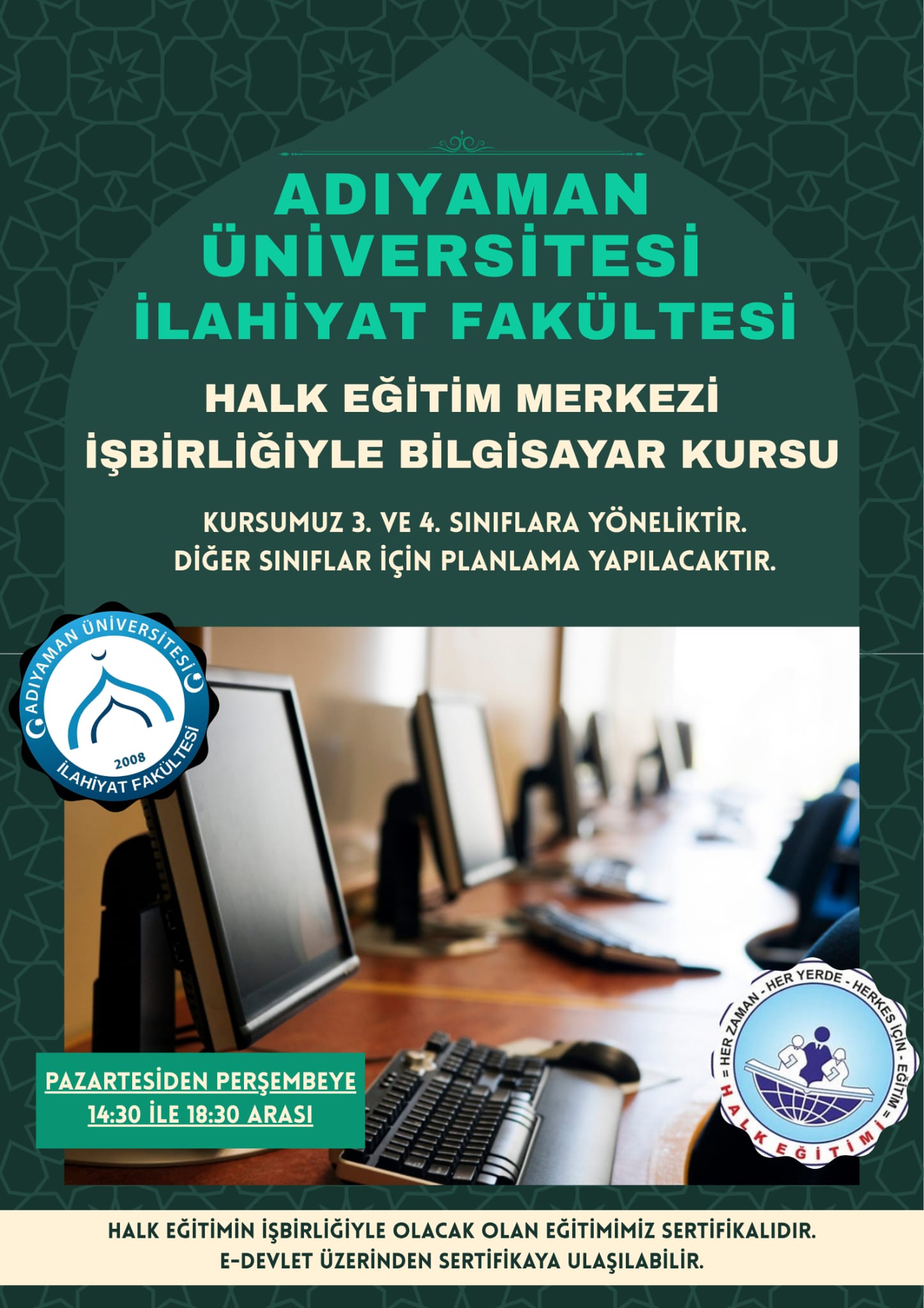 Adıyaman Üniversitesi İlahiyat Fakültesi'nin Halk Eğitimle işbirliği içinde hazırladığı Bilgisayar Kursu eğitimi başlamıştır. Geçen yılda düzenlenen bu eğitime bu yıl 40'tan fazla öğrenci katılmıştır.Bu eğitimle öğrencilerimizin bilgi ve becerilerini teknolojik anlamda da geliştirmesi hedeflenmektedir.
