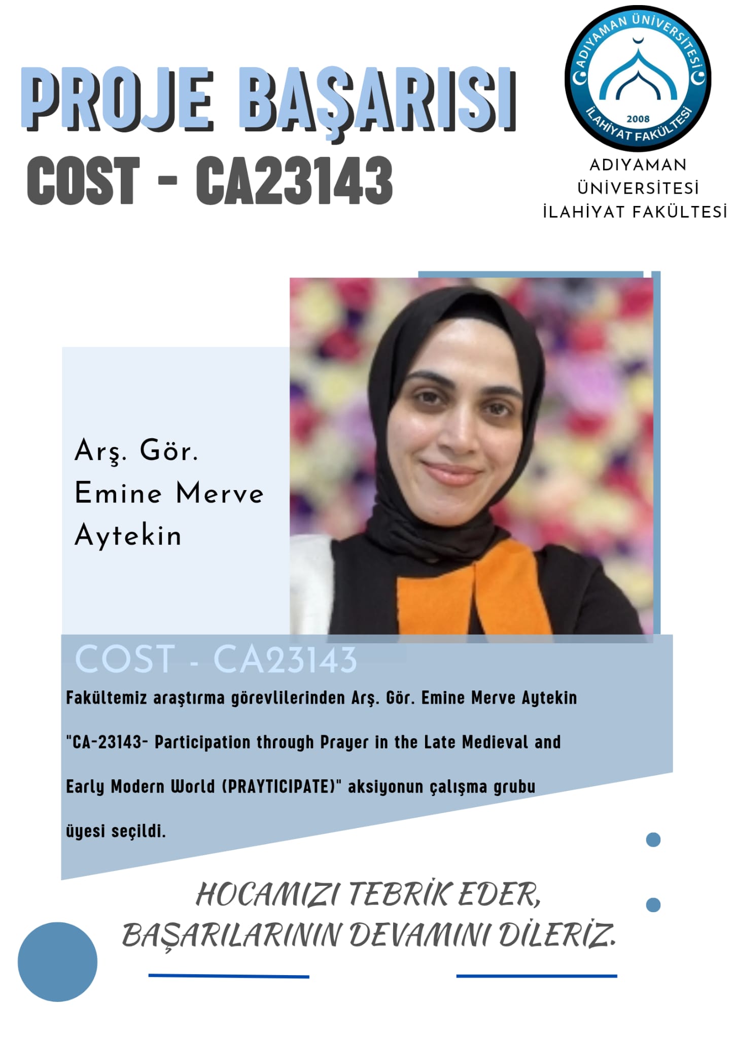 Adıyaman Üniversitesi İlahiyat Fakültesi Arş. Gör. Emine Merve AYTEKİN COST-CA23143 aksiyonuna çalışma grubu üyesi olarak seçildi.