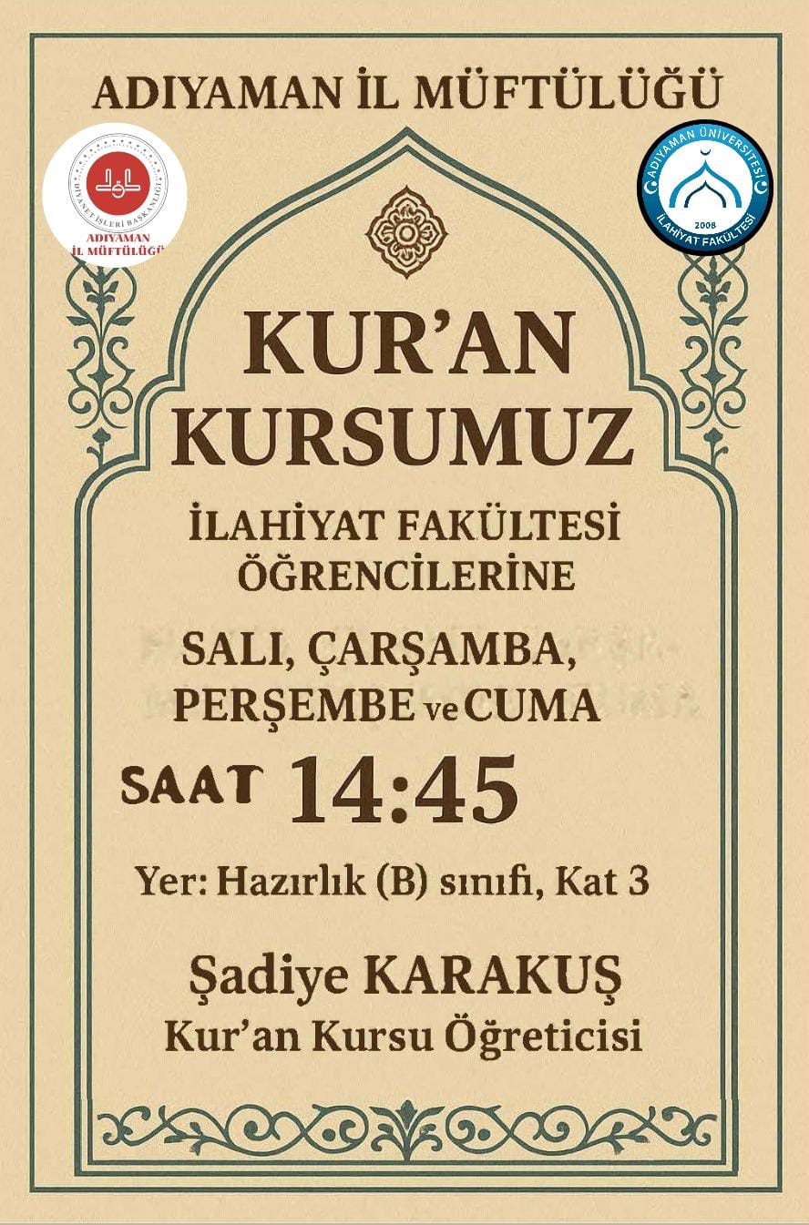 DİB'te 14 yıldır Kuran kursu hocalığı tecrübesi olan Şâdiye KARAKUŞ fakültemizde Kur'ân eğitimi verecektir.Bilgisi ve tecrübesiyle kız öğrencilerimize yönelik Hazırlı B sınıfında 14:45'ten itbaren kıraat, meharic-i huruf, tecvid, talim ve ezberleriniz noktasında yardımcı olacaktır. Gönüllülük esasına bağlı olan bu derslere özellikle alt yapısı zayıf olan arkadşlarla ezberlerde sıkıntı çeken, tecvidi halledemeyen, okuyuşunu ilerletemeyen öğrencilere destek olacatır.