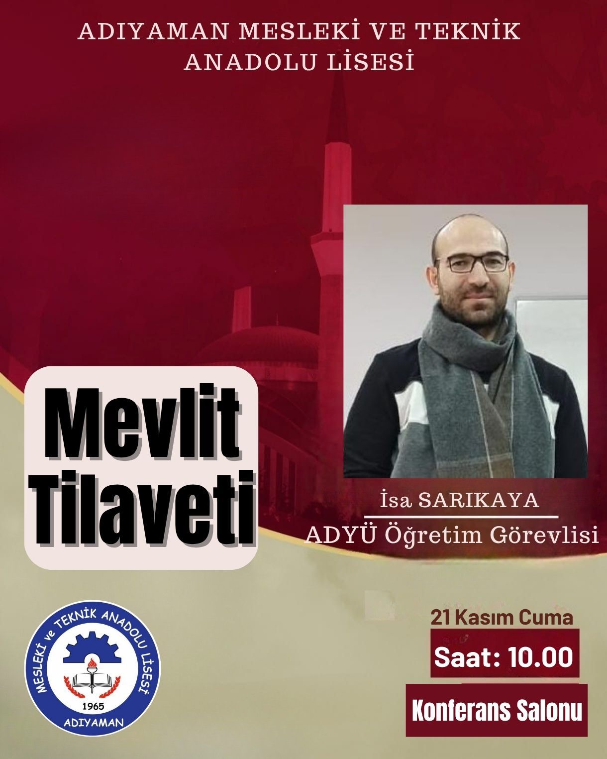 Adıyaman Mesleki ve Teknik Anadolu Lisesi tarafından Mevlid-i Nebi programı gerçekleştirildi. Etkinliğe Öğr. Görevlisi İsa Sarıkaya ve Arş. Gör. Nurullah Türk de katıldı.
