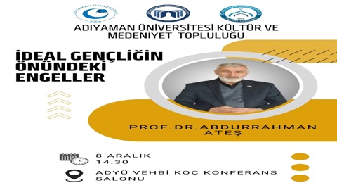04Ara2025 “İdeal Gençliğin Önündeki Engeller” Konulu Konferans DüzenlendiAdıyaman Üniversitesi Kültür ve Medeniyet Topluluğunun düzenlediği ,Prof. Dr. Abdurrahman Ateş'in katılımıyla gerçekleşt...