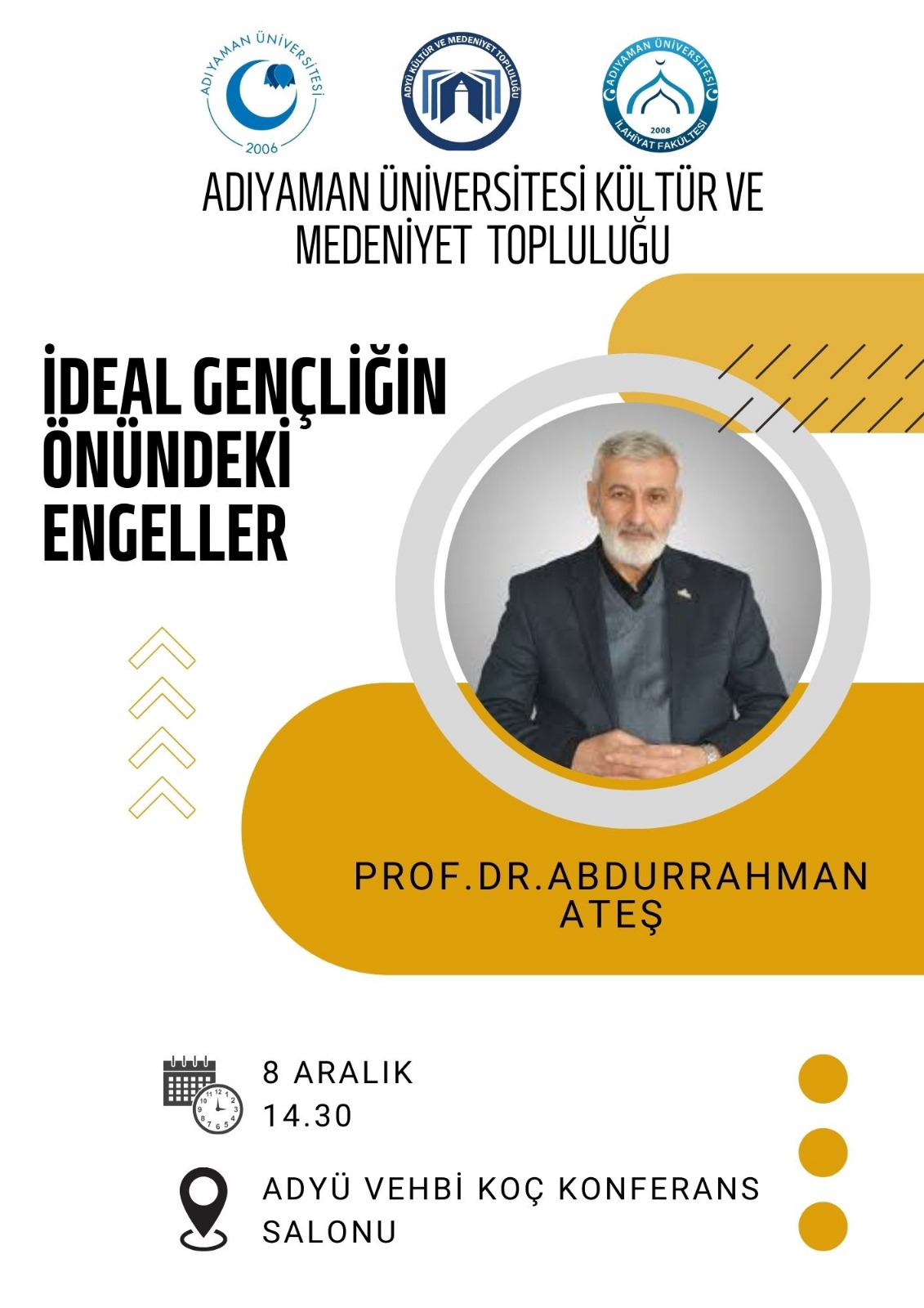 Adıyaman Üniversitesi Kültür ve Medeniyet Topluluğu tarafından düzenlenen, Prof. Dr. Abdurrahman Ateş’in konuşmacı olarak katıldığı “İdeal Gençliğin Önündeki Engeller” konulu konferans gerçekleştirildi.