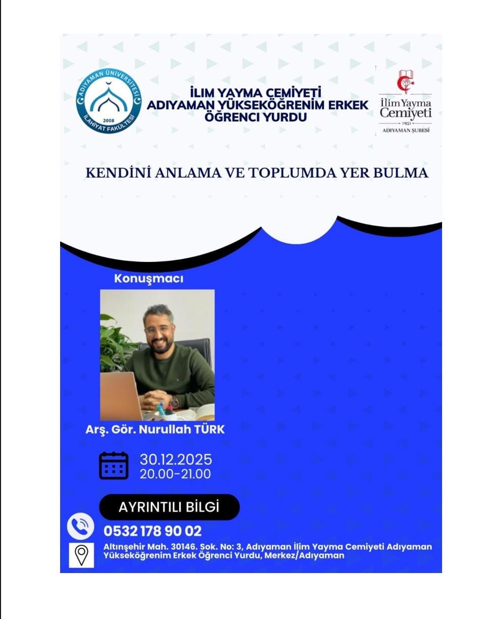 İlim Yayma Cemiyeti Adıyaman Erkek Öğrenci Yurdu’nda 30 Aralık günü saat 20.00’da Üniversiteli gençlere yönelik “Kendini Anlamak, Toplumda Yer Bulmak ve Zaman Yönetimi” konulu bir söyleşi gerçekleştirilmiştir. Arş. Gör. Nurullah TÜRK tarafından yönetilen söyleşide; Hedef oluşturma, oluşturulan hedeflerin gereklilikleri, hedefin önemi ve toplumsal zeminde bu hedeflerin artısı/eksisi üzerinde durulmuştur. Ayrıca söyleşide zamanın değerlendirilmesi ve zaman yönetimi üzerinde de durulmuştur. Öğrencilere önce kısa vadeli sonra uzun vadeli hedef oluşturmanın avantajları ve gereklilikleri anlatılmaya çalışılmıştır